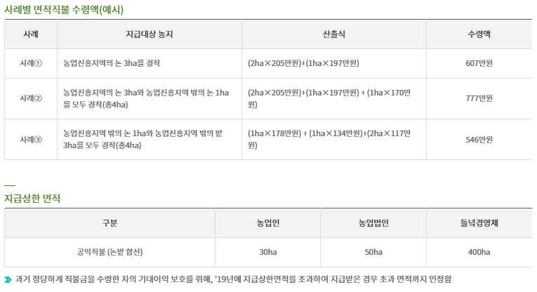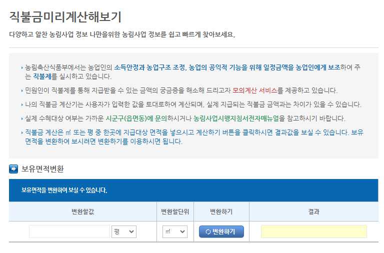 농림축산식품부에서 운영하는 홈페이지를 이용하면, 본인의 직불금이 얼마인지 미리 계산하는 서비스를 제공하고 있으니, 활용을 해보시기 바랍니다.
