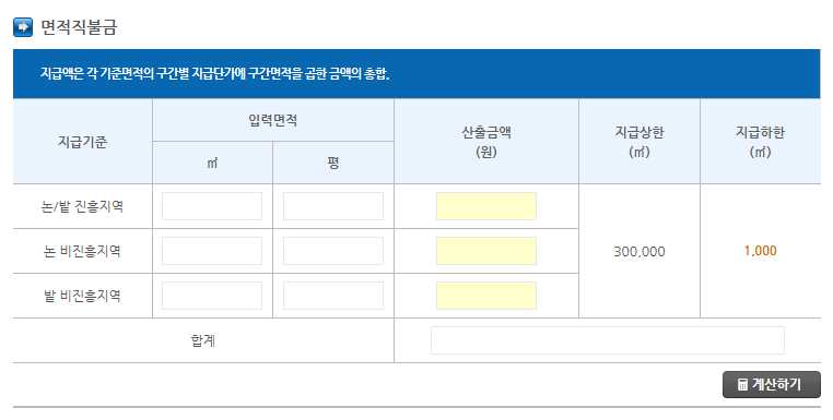 - 소규모 농지일수록 높은 금액이 지급되며, 대규모 농지의 경우 상대적으로 낮은 단가로 계산됩니다.