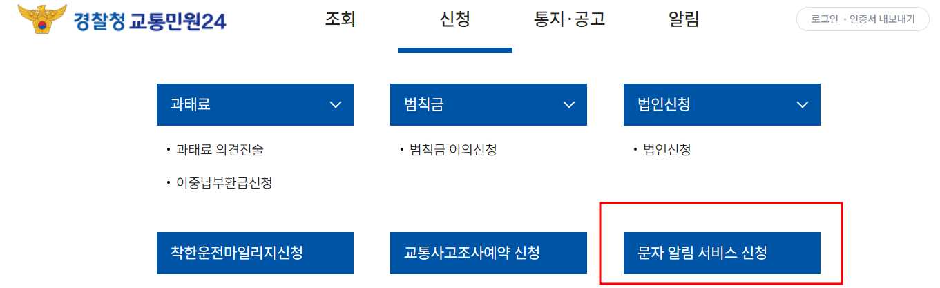 - 상단메뉴 > 신청 > '문자 알림 서비스 신청'을 클릭합니다.