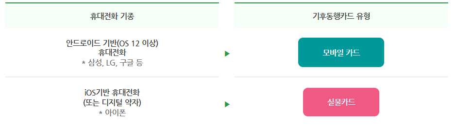 단, 모바일카드는 안드로이드(갤럭시) 핸드폰을 이용하는 분들만 신청하여 사용할 수 있습니다. 애플 아이폰을 사용하시는 분들은 실물카드를 구매하여 이용해야 합니다.