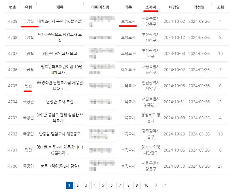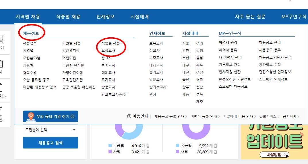 4) 국공립 채용정보, 보육교사 채용정보, 대체교사 채용정보 등 다양한 탭이 존재하니 참고하셔서 구인란을 확인하시면 됩니다.