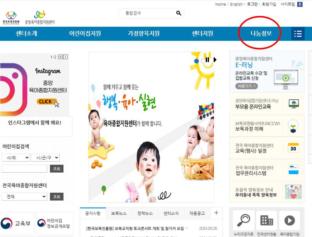 1) 중앙육아종합지원센터 홈페이지에 접속을 합니다.