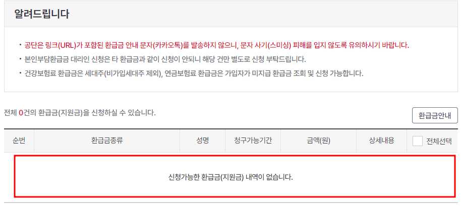 4) 다시 아래 항목에 환급금(지원금) 조회신청을 클릭합니다.
