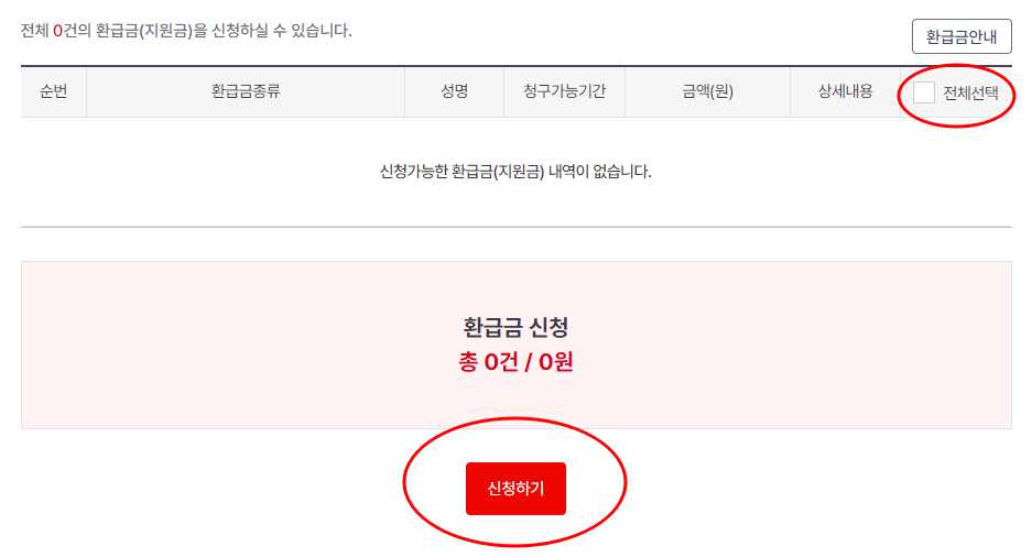 조회를 완료하셨다면 조회내역에서 우측에 전체선택을 눌러서 모두 선택을 한 뒤에 아래에 '신청하기' 버튼을 눌러서 신청을 하시면 됩니다.