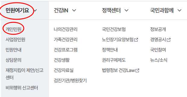 2) 상단메뉴에서 민원여기요를 누르고 '개인민원'을 클릭합니다.