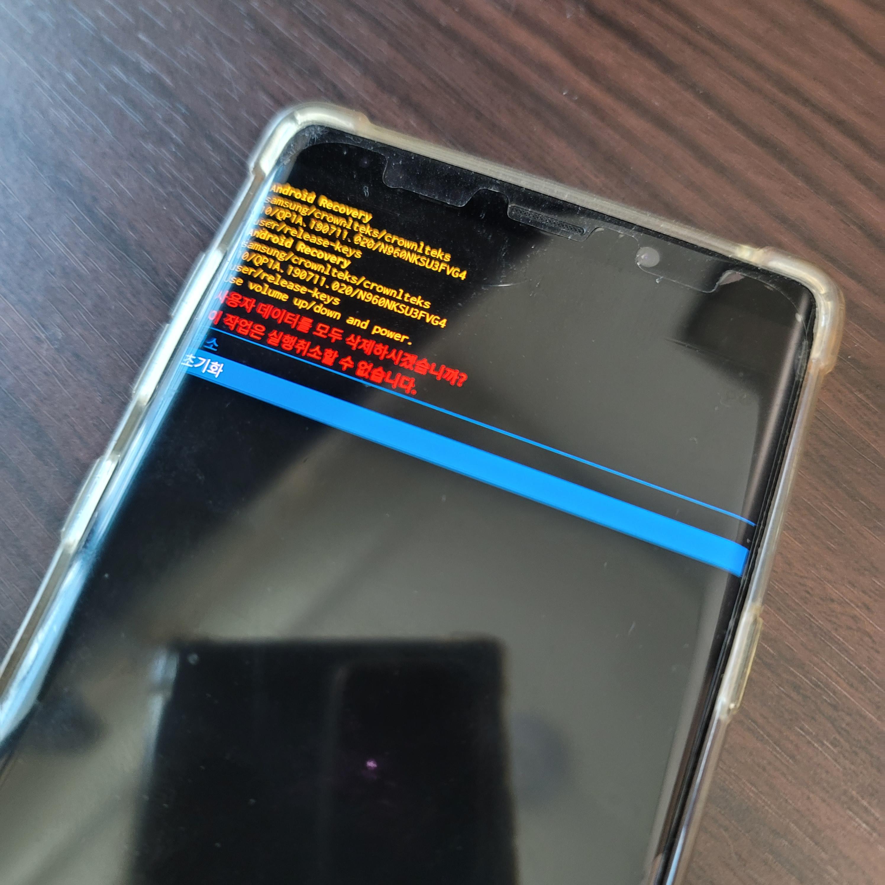 그러면 갤럭시 휴대폰이 켜지는 화면이 나오면서 리커버리 모드로 진입을 하게 됩니다. 리커버리 모드에서는 음량 조절키로 위,아래를 이동할 수 있고, 전원버튼이 확인버튼입니다.