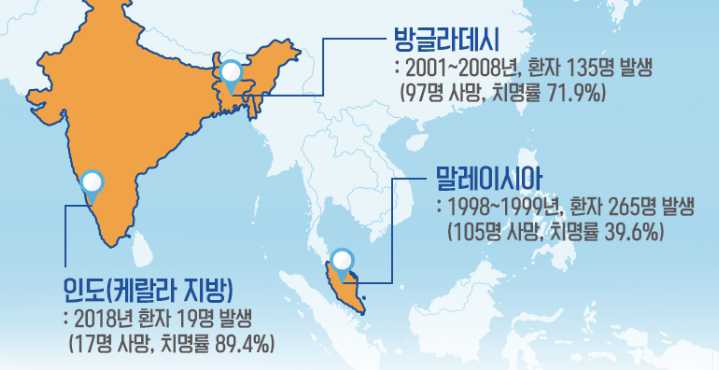 예방을 위해서는 인도나 방글라데시, 싱가포르, 말레이시아 등 해당 국가를 방문하지 않는 것이 가장 좋을 것으로 생각됩니다. 해당 지역에서는 과일박쥐와의 접촉을 피하고 야자수 수액 섭취 등 감염 환자와의 접촉을 피해야 합니다.