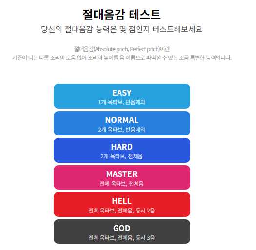 절대음감과 달리 상대음감 테스트는 먼저 음을 들려주고 테스트를 진행하기 때문에, 기준 음을 듣고 판단해서 상대음감 테스를 할 수 있습니다.
