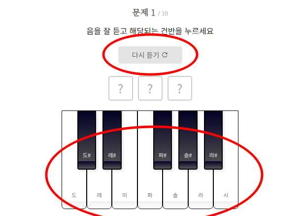 2. 다시 듣기를 누르면 음을 들을 수가 있고, 예시로 음을 들려주지 않기 때문에 듣자마자 알 수 있다면 절대음감이라 할 수 있습니다.
