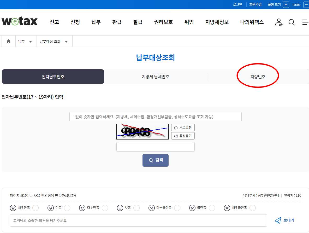 4) 납부대상조회 페이지에서 전자납부번호, 지방세 납세번호, 차량번호의 3개의 탭 중에 '차량번호'를 클릭합니다.