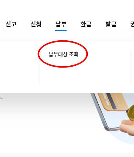 3) 납부 > '납부대상 조회'를 눌러 들어갑니다.