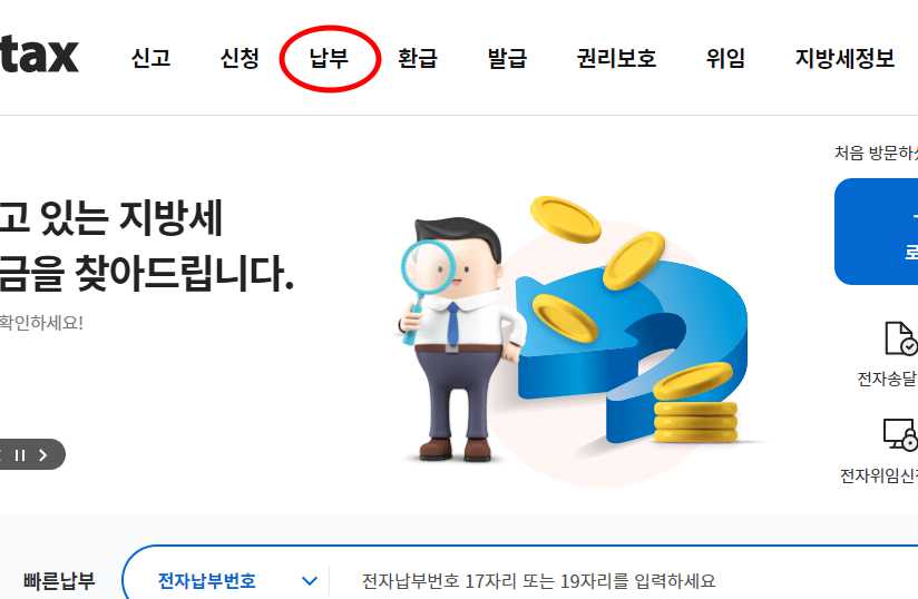 2) 메인화면 상단에 있는 메뉴에서 '납부'를 클릭합니다.