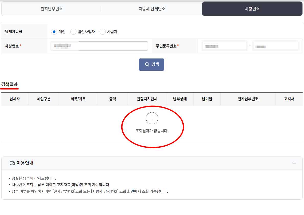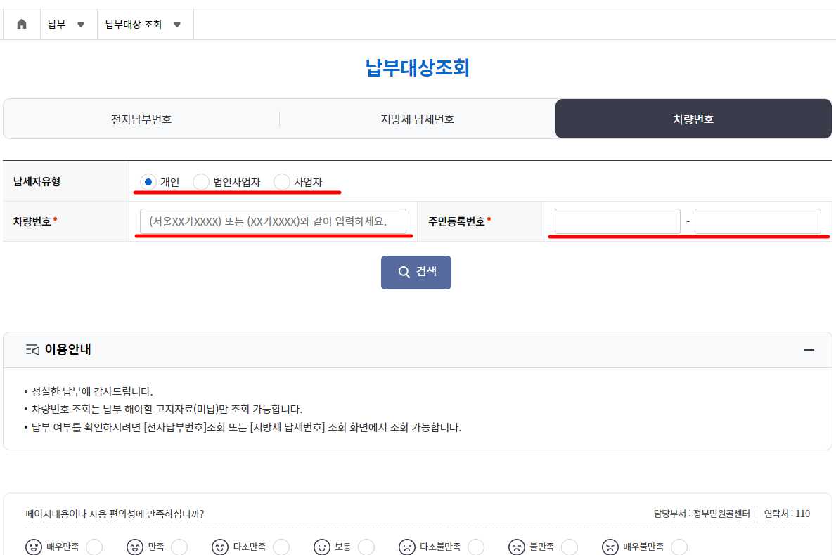 5) 납세자유형에서 개인, 법인, 사업자를 선택하고, 차량번호 앞자리까지 입력을 해준 뒤에 주민등록번호까지 입력하고 '검색'을 누릅니다.