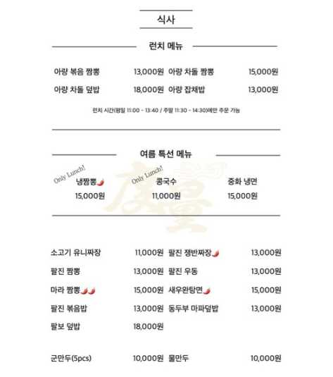 점심에는 좀 저렴하게 이용할 수 있게 짬뽕과 덮밥, 잡채밥 메뉴도 있고, 냉짬뽕과 콩국수, 중화냉면은 여름에만 먹을 수 있습니다.