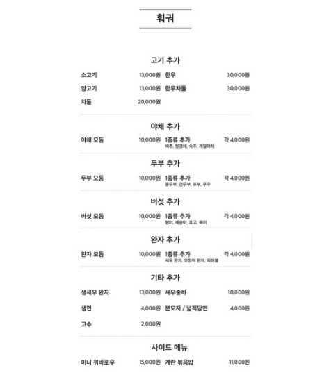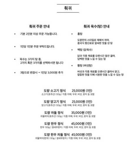 그리고 정식메뉴도 있는데요, 소고기, 양고기, 차돌, 한우차돌의 정식메뉴가 있고 훠거는 홍탕, 백탕, 황탕이 있는데 선택을 하시면 되고, 훠거는 2인분 이상 주문 가능합니다.
