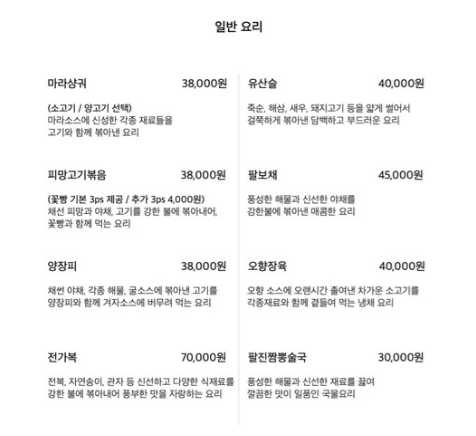 흑백요리사에서도 말했다시피 동파육이 메인이고 제일 반응이 좋다고 하니, 동파육은 꼭 먹어봐야 합니다. 그리고 튀김요리는 꿔바로우, 깐풍기, 크림새우등이 있고, 팔보채나 양장피, 전가복 등 중식메뉴는 다 있다고 보시면 됩니다.