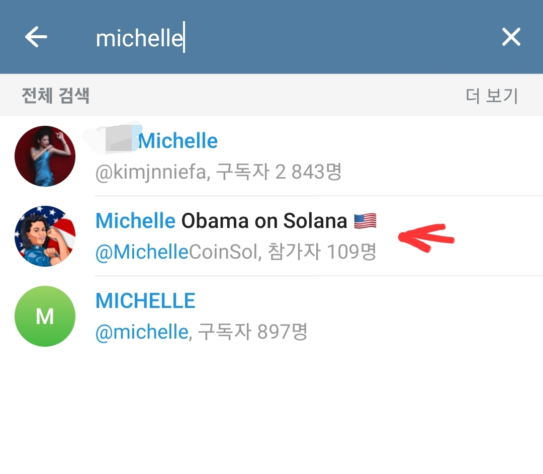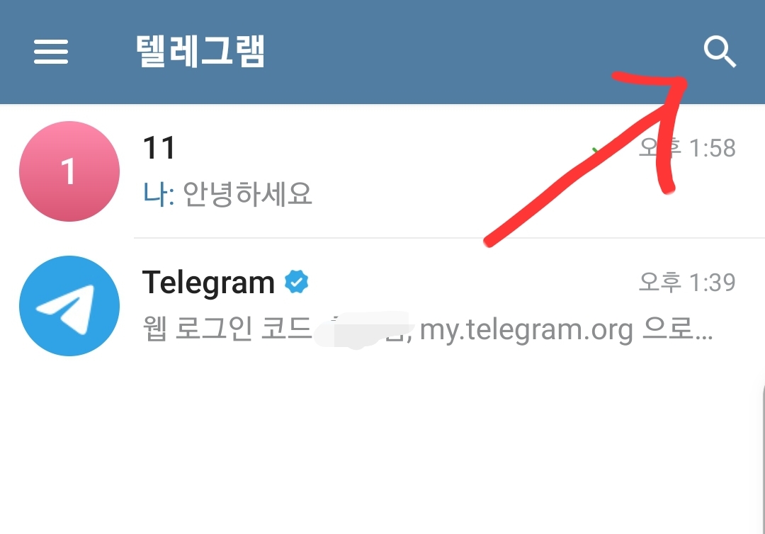 1) 텔레그램 사용법은 먼저 우측에 돋보기 모양을 눌러서 대화방이나 채널을 들어갈 수가 있습니다.
