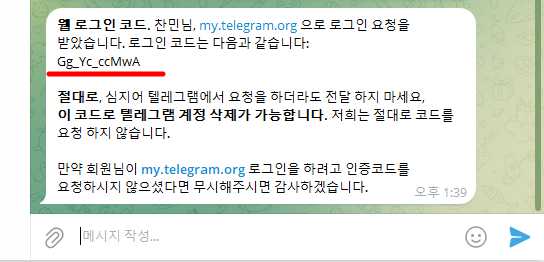 3) 입력을하고 Next를 누르면 위에 사진과 같이 코드를 입력하라는창이 뜨면서 아래 사진과 같이 코드가 내 텔레그램 메시지로 전달이 됩니다.