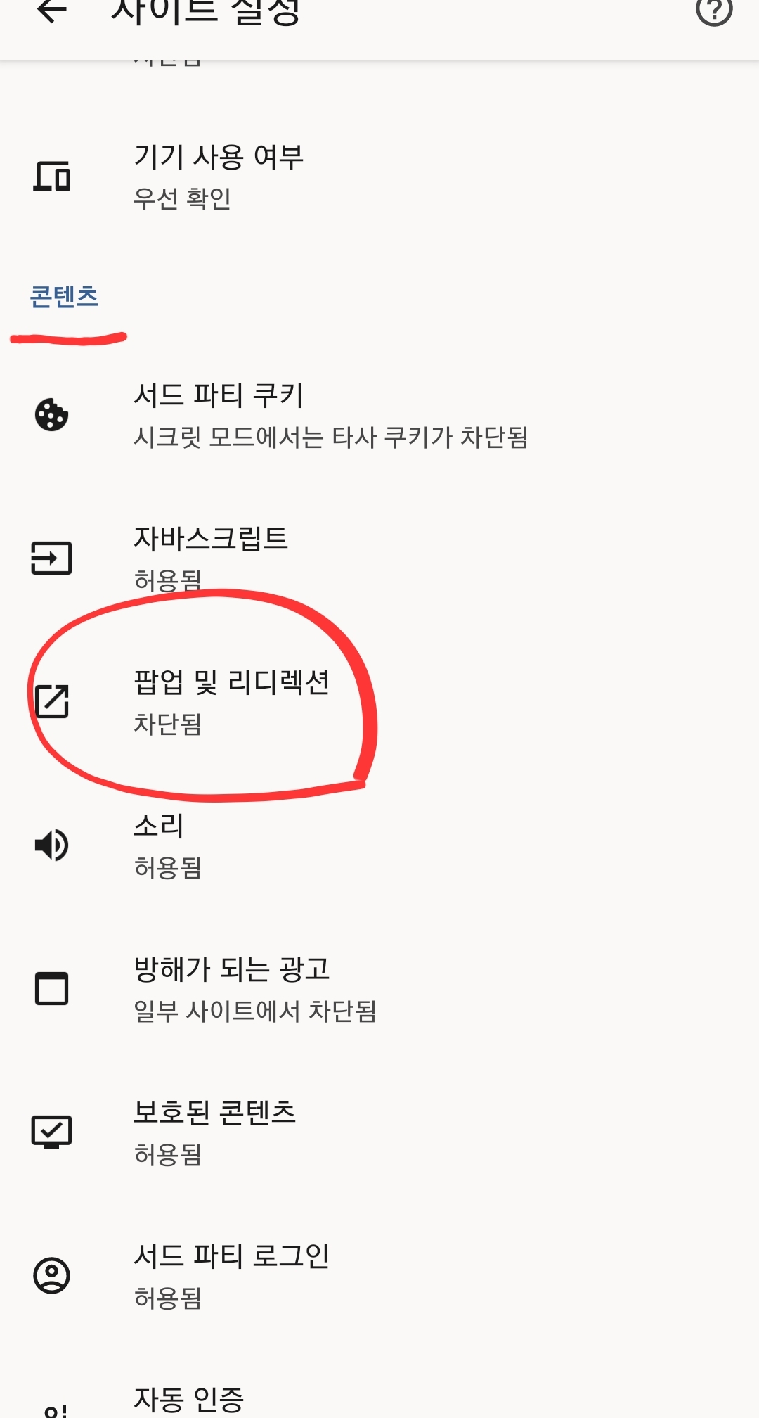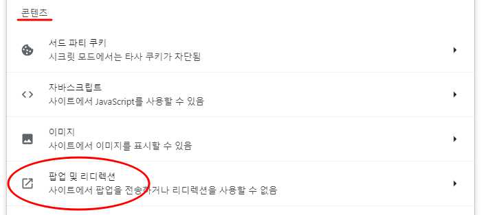 5.콘텐츠 탭에 '팝업 및 리디렉션'을 클릭하여 팝업이 차단된걸 허용합니다.