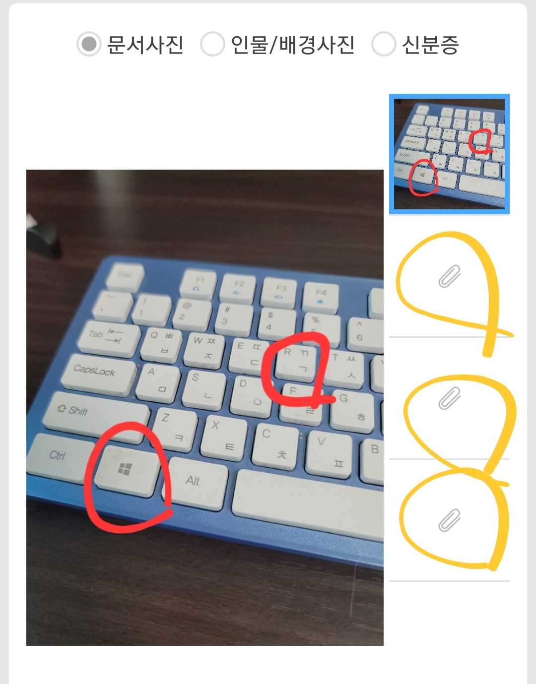 5) 아래에는 문서사진, 인물/배경사진, 신분증 3개의 선택란이 있는데, 해당하는걸 선택해주시면 되고 딱히 맞는게 없으신 분들은 문서사진을 선택해주시면 됩니다.