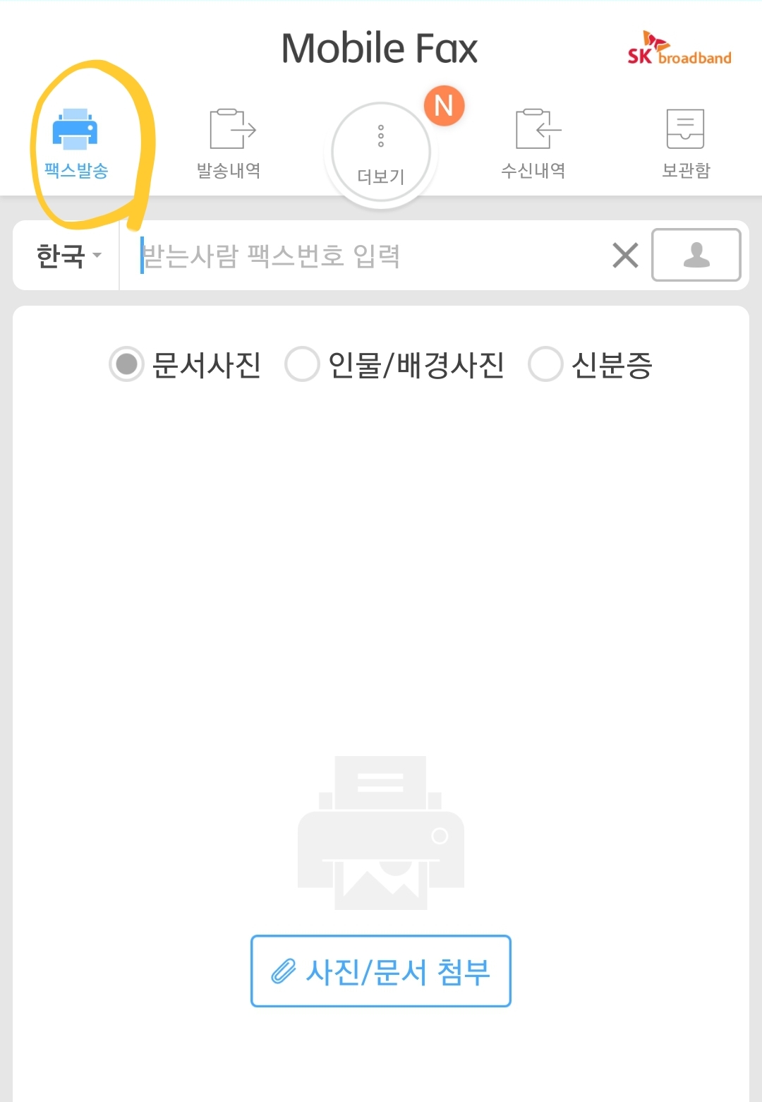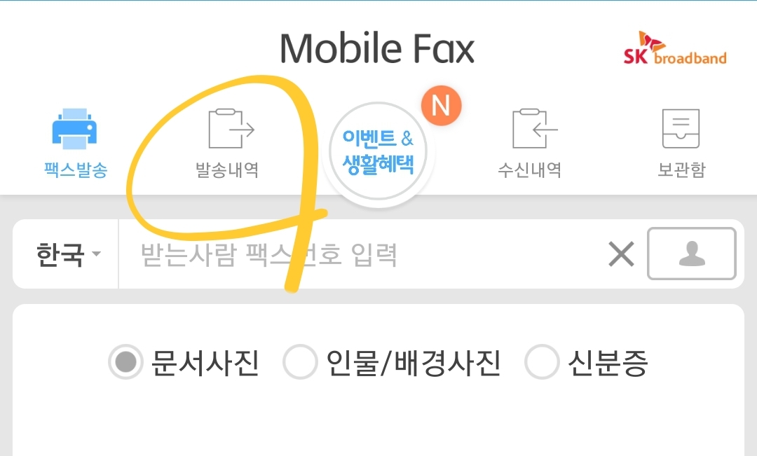 3) 모바일팩스를 눌러서 시작하면 상단메뉴에 '팩스발송' 버튼을 눌러줍니다.