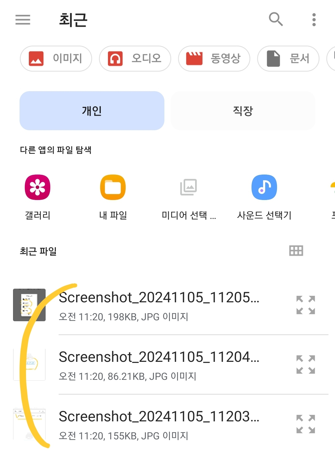 8) 파일을 선택하면 내 스마트폰에서 파일을 볼 수 있는 창이 열리는데, 거기서 해당 파일을 찾아서 선택해주시면 됩니다. 사진첩에 있는 사진파일도 여기서 선택이 가능하니 참고하시기 바랍니다.