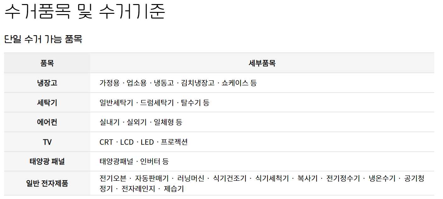 이것들 말고도 다른 가전제품들도 다 가능하며, 자세한 품목이나 수거 불가 품목은 e순환거버넌스 홈페이지에서 확인 가능합니다.