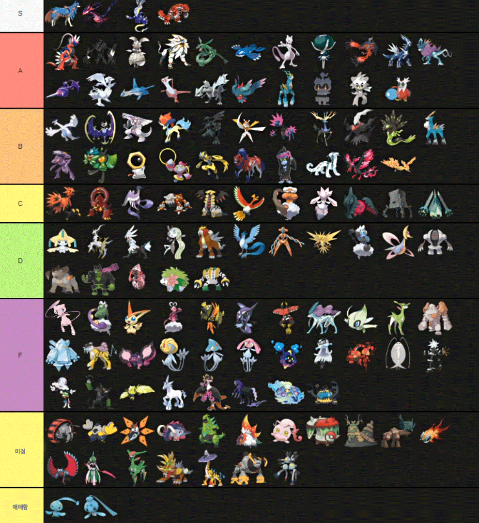 - 4티어: 가라르썬더, 볼케니온, 가라르프리져, 히드런, 기라티나, 칠색조, 랜드로스, 디안시, 레지드래고, 차곡차곡, 철화구야