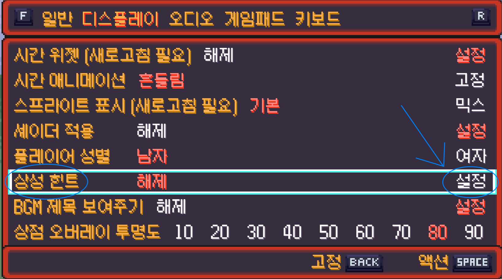 - 아래로 내리시면 '상성 힌트' 탭에서 설정으로 변경해줍니다.