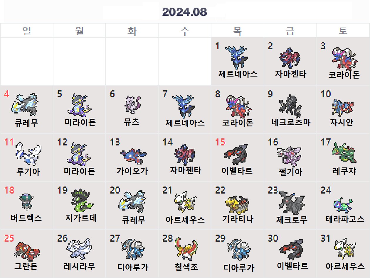 포켓로그 전설 픽업은 포켓로그에는 알 뽑기 시스템이 존재하는데, 매일매일 알뽑기에서 전설 픽업 확률을 높여주는 시스템을 제공하고 있습니다. 매일 픽업 전설포켓몬이 다르기 때문에 아래 사진을 통해 원하시는 포켓몬이 나올때 맞춰서 알 바우처를 모아두셨다가 사용하시기 바랍니다. 8월 전설 픽업 내용입니다.