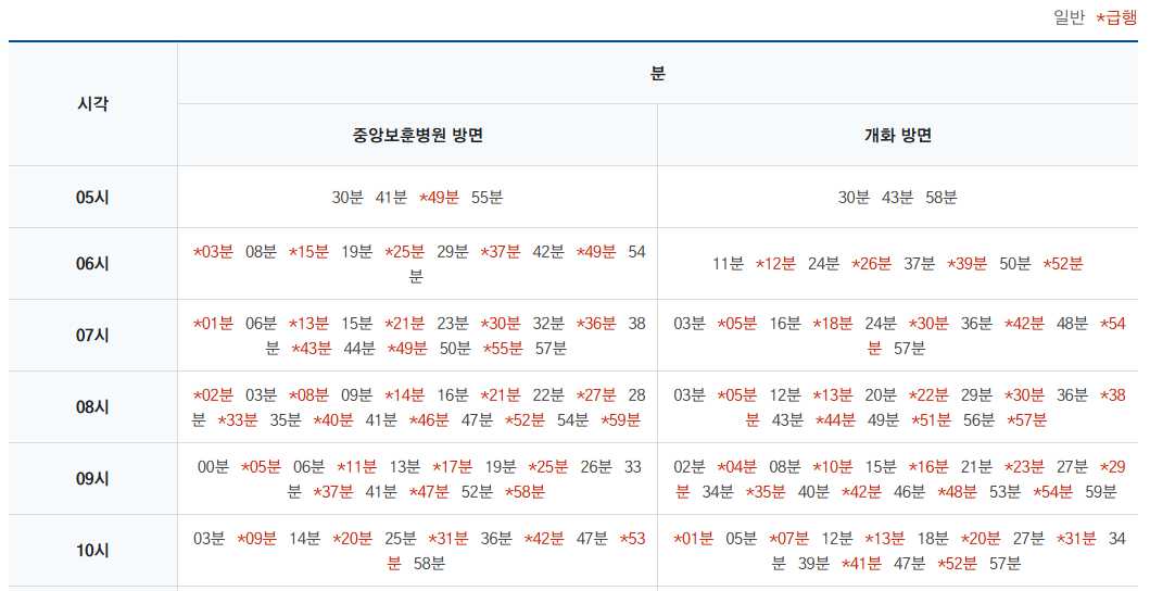 - 해당 시간표에서 빨간색의 *이 표시된 시간이 급행 시간표이며, 개화방면과 중앙보훈병원방면 모두 확인을 하실 수 있습니다.