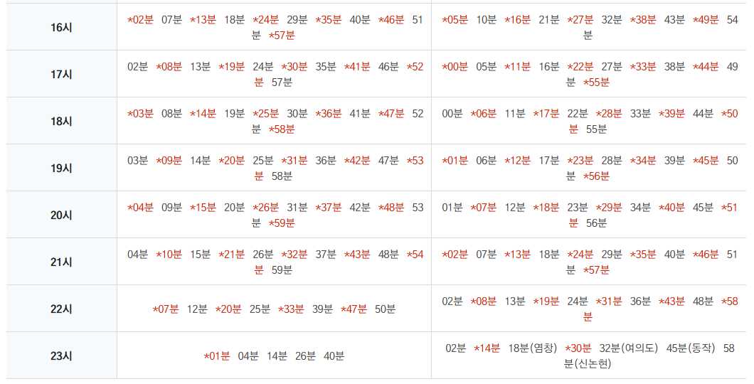 - 해당 시간표에서 빨간색의 *이 표시된 시간이 급행 시간표이며, 개화방면과 중앙보훈병원방면 모두 확인을 하실 수 있습니다.