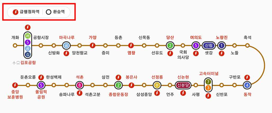 9호선 급행 정차역은 노선도 사진에서 빨간색의 급행표시가 되어있으니 참고하시기 바랍니다.