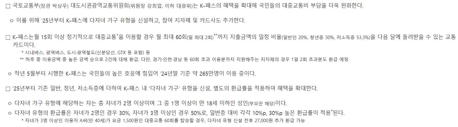 2자녀 가구는 30%의 환급 할인 혜택을 받을 수 있고, 3자녀 이상인 가구는 50%까지 환급을 받을 수 있습니다. 기존의 K패스 이용자보다 훨씬 더 높은 혜택을 제공합니다.